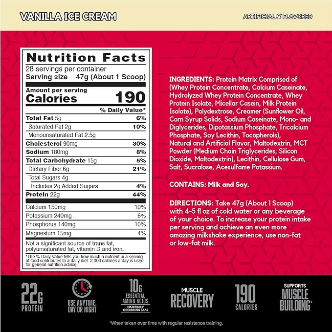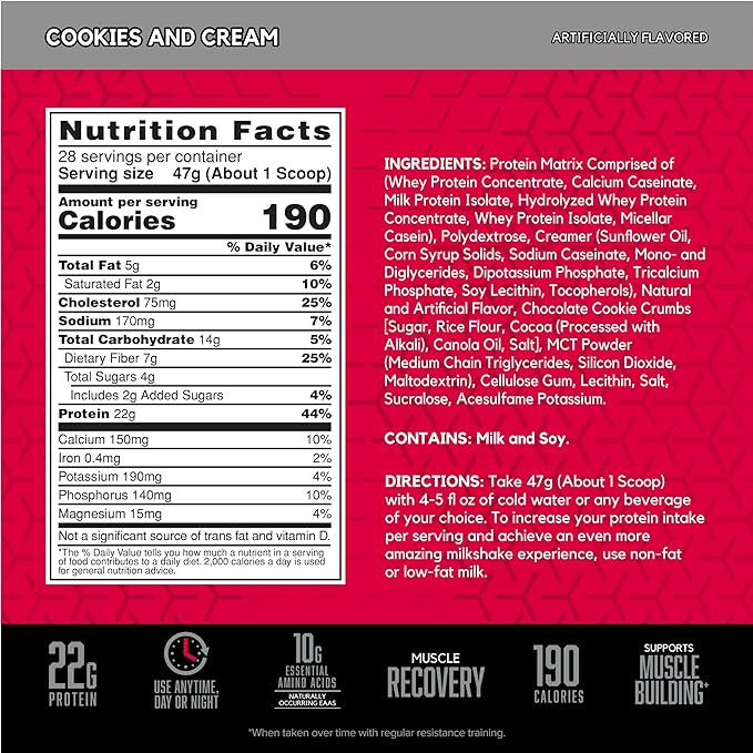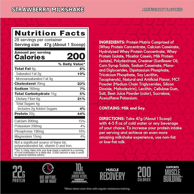 It promotes muscle protein synthesis and recovery and contains a 22 gram protein matrix consisting of whey protein concentrate, whey protein isolate, calcium caseinate, micellar casein, milk protein isolate, and egg albumin.